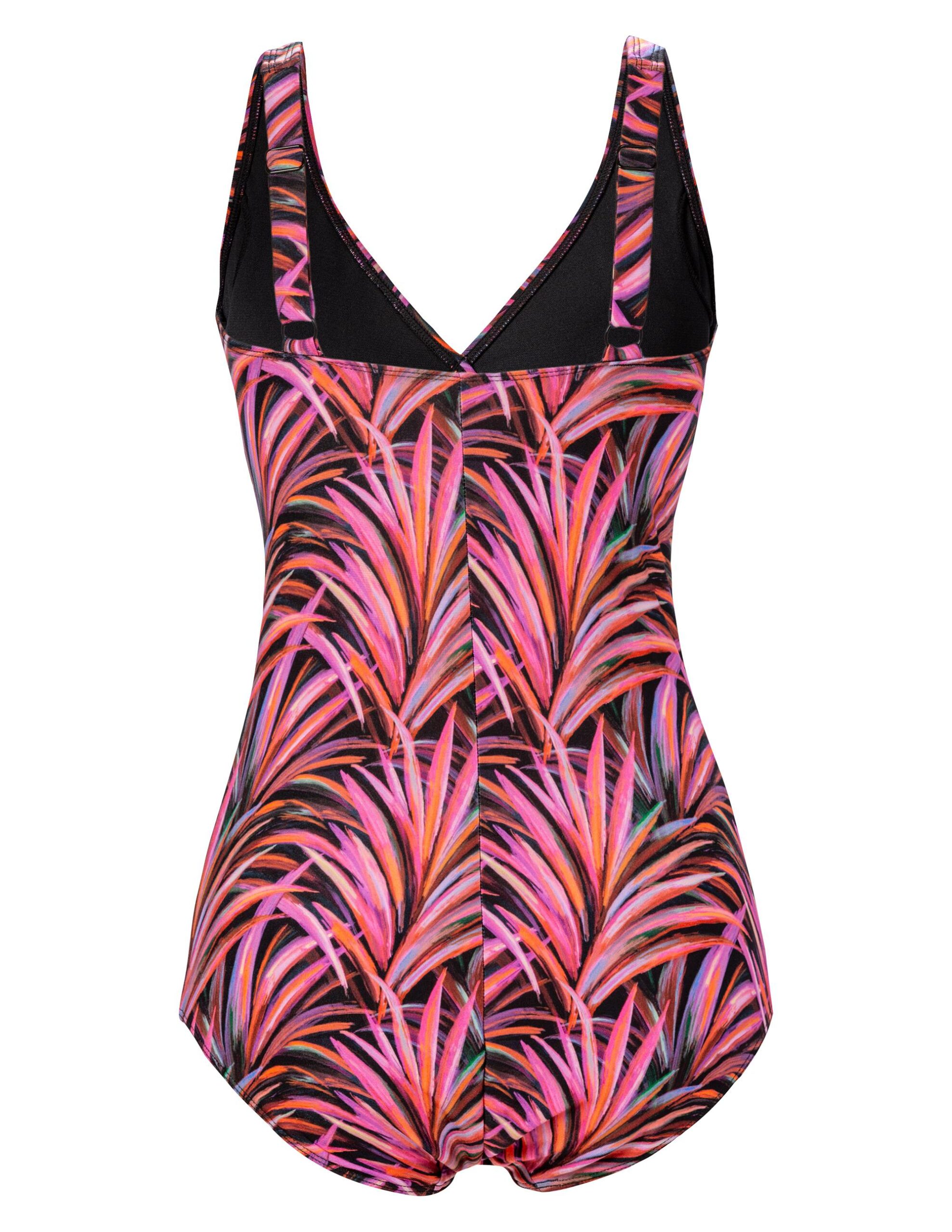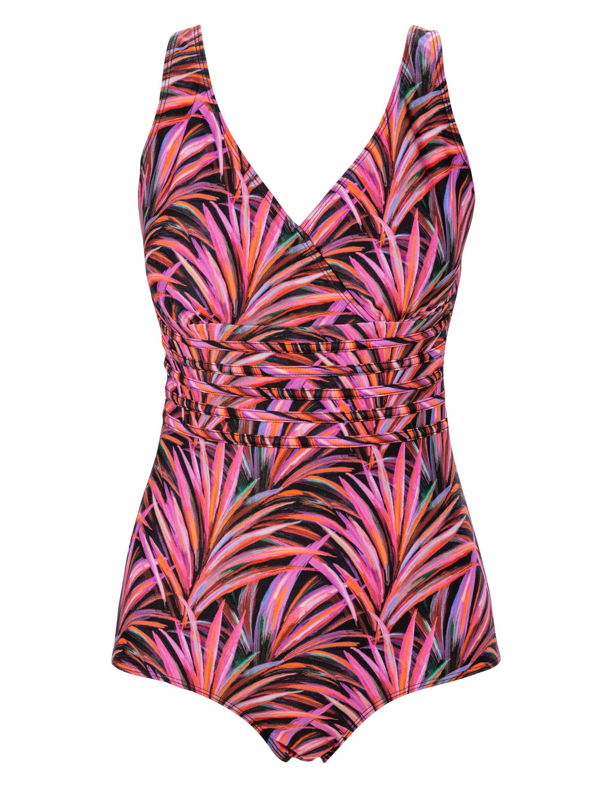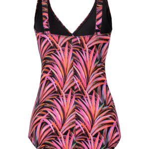 Klortålig baddräkt med tropiskt bladmönster. Smickrande omlottskärning över byst. Påsydda, dekorativa band under byst som även hjälper till att forma och hålla in baddräkten fint. Fodrad framtill. Uttagbar vaddering i kupan, möjlig för protes. Breda justerbara axelband. Låg benskärning. Helmönstrad modell. Collection: Colour Palm