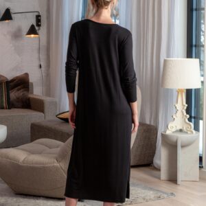Långärmat nattlinne i härligt mjuk viskostrikå av Lenzing EcoVero som är producerad på ett mer miljömässigt, hållbart sätt. Mjukt V-formad halsringning. Fickor i sidsömmarna. Slits i sidorna. Längd: 120 cm i stl M