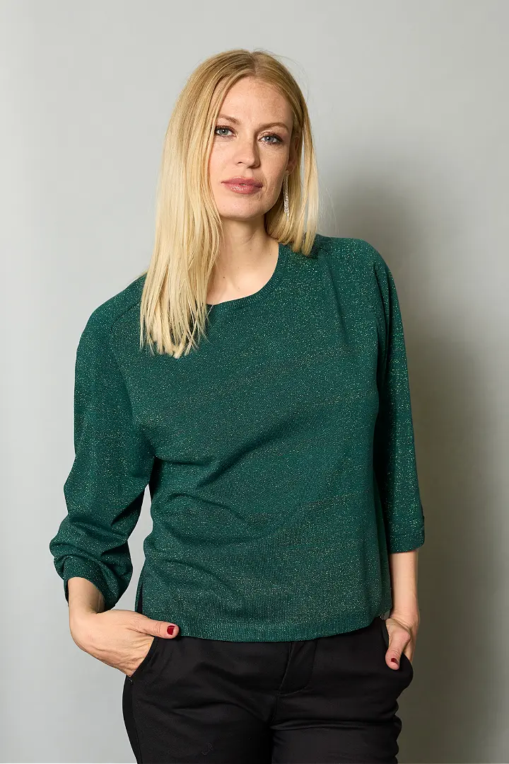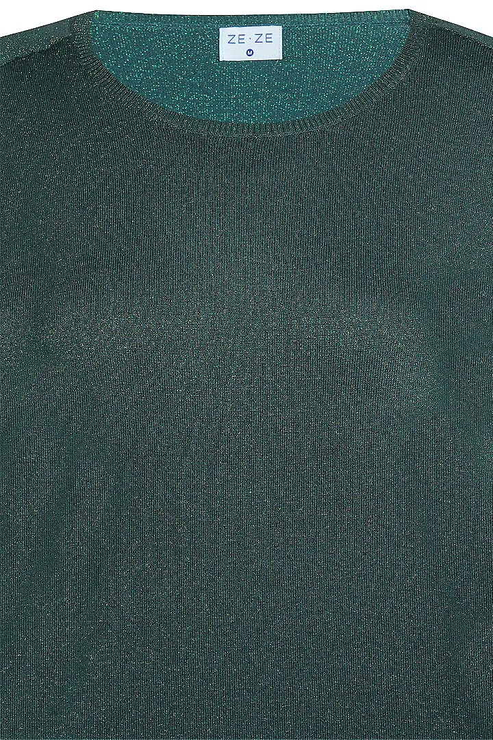 Tunn stickad glittrande tröja från ZE-ZE Rund halsringning. Smala muddar vid ärmslut och fåll. Korta slitsar i nederkant.